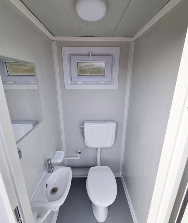 1x Contenedor sanitario WC con cabina doble – baño para hombres y mujeres – RAL 9002 Blanco